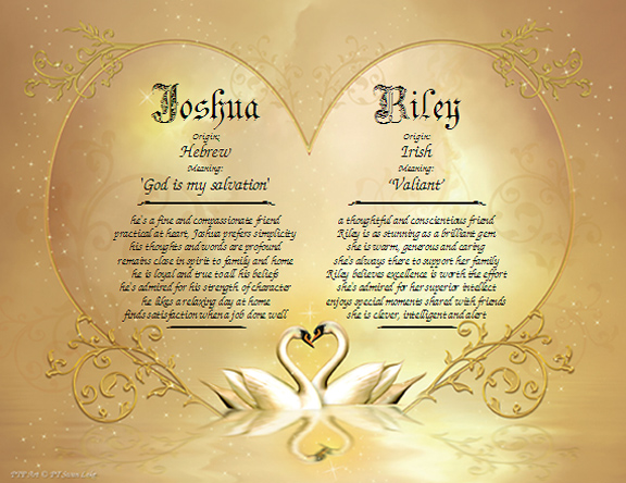 Double Name GiftDesign a beautiful Double Name Meaning Gift in just a couple of minutes. Each name gift includes the first name displayed in an extra large ornate font, the meaning, origin, and 8 virtues or characteristics unique to that name. This makes a great gift for couples of all ages. Perfect for weddings, anniversaries, dating couples, and children too. You select the art background, frame and of course the first names of the couple. You can also add a personal message if desired. Click the CONTINUE button to get started.